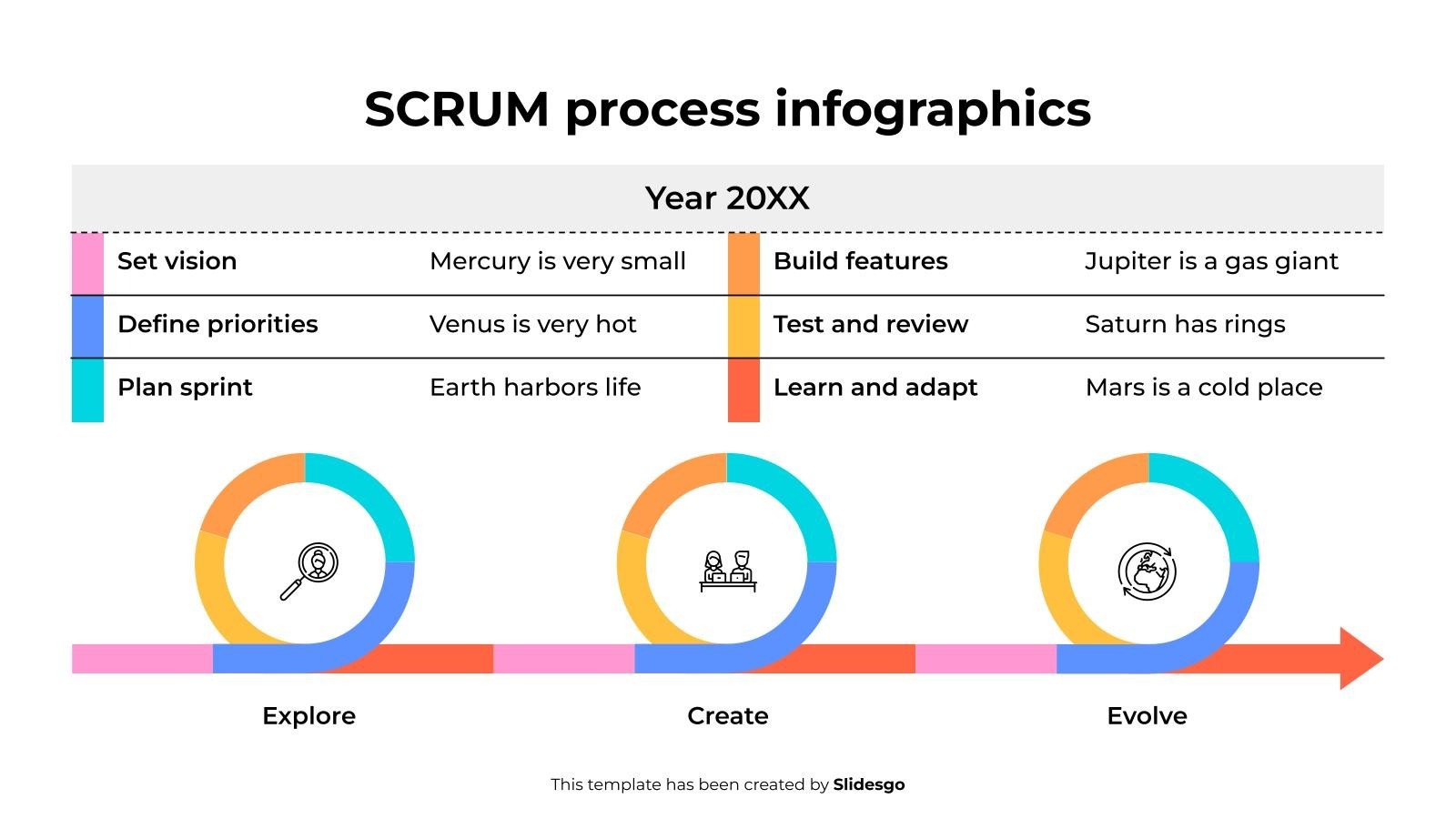 下载适用于 PowerPoint 或 Google 幻灯片的 SCRUM 流程信息图表模板,以充分利用信息图表。无论您是想在表格中组织您的业务预算,还是想示意性地分析您过去一年的销售额,这套信息图表资源都将有很大帮助。立即开始使用信息图表,将您的业务或营销演示提升到一个新的水平。