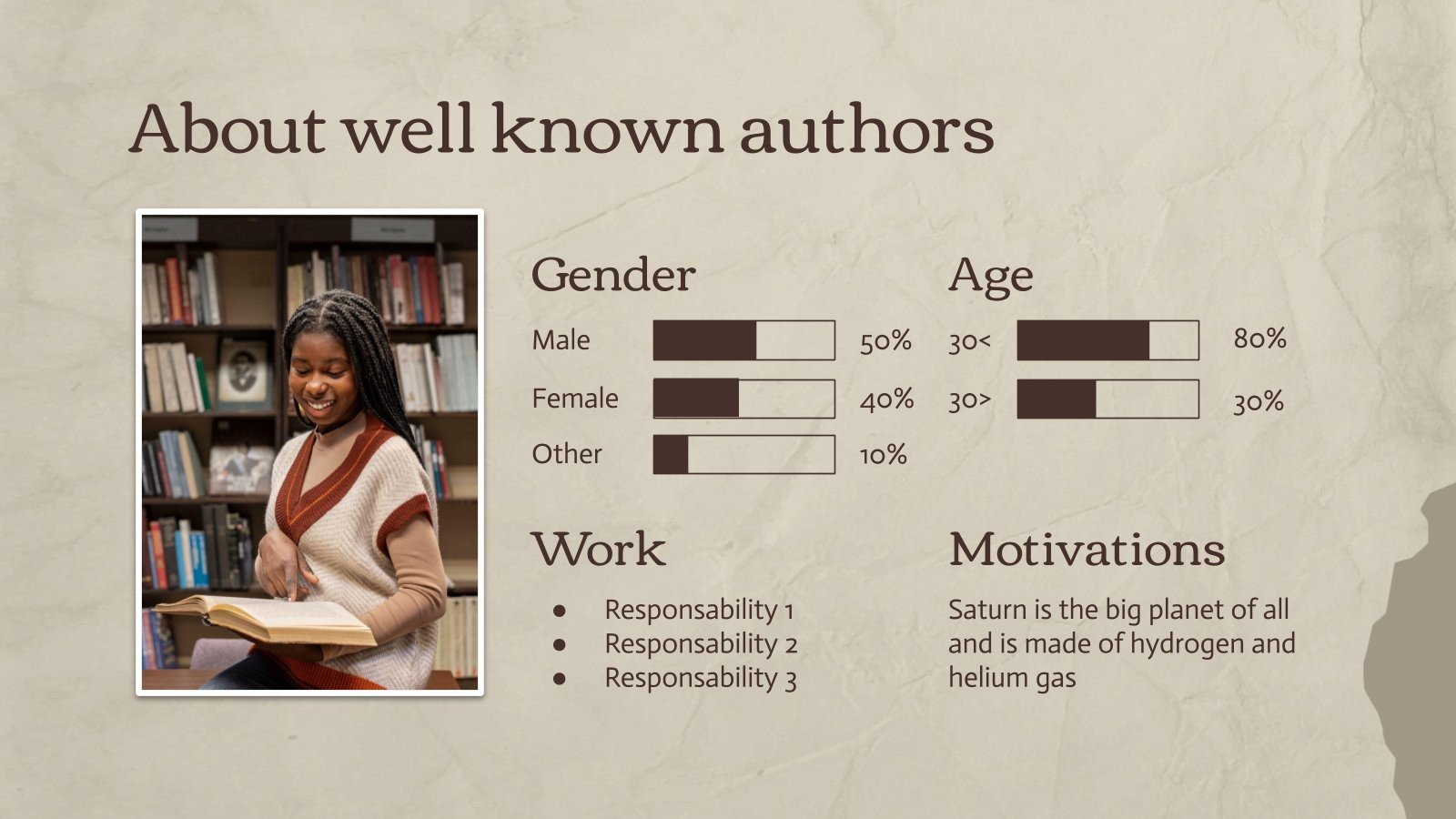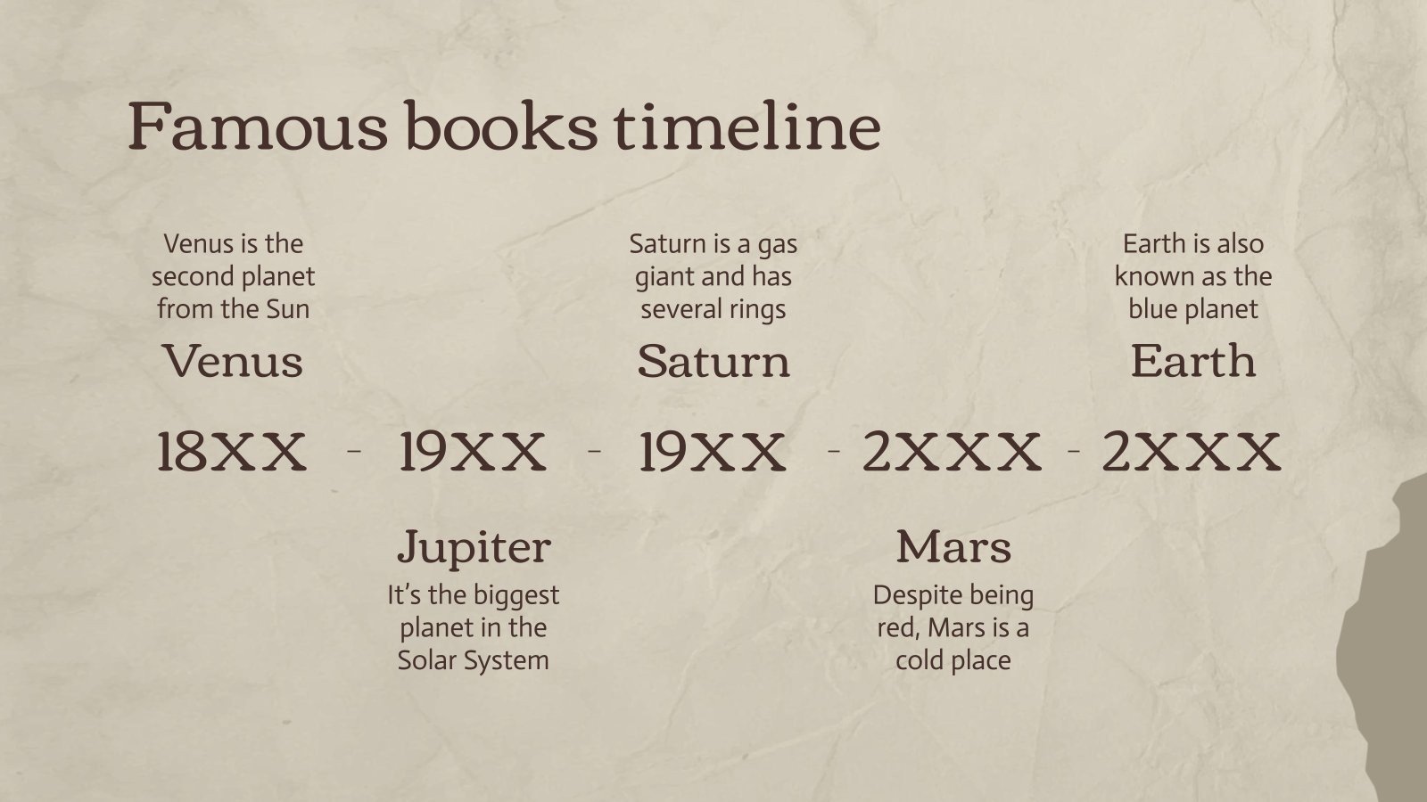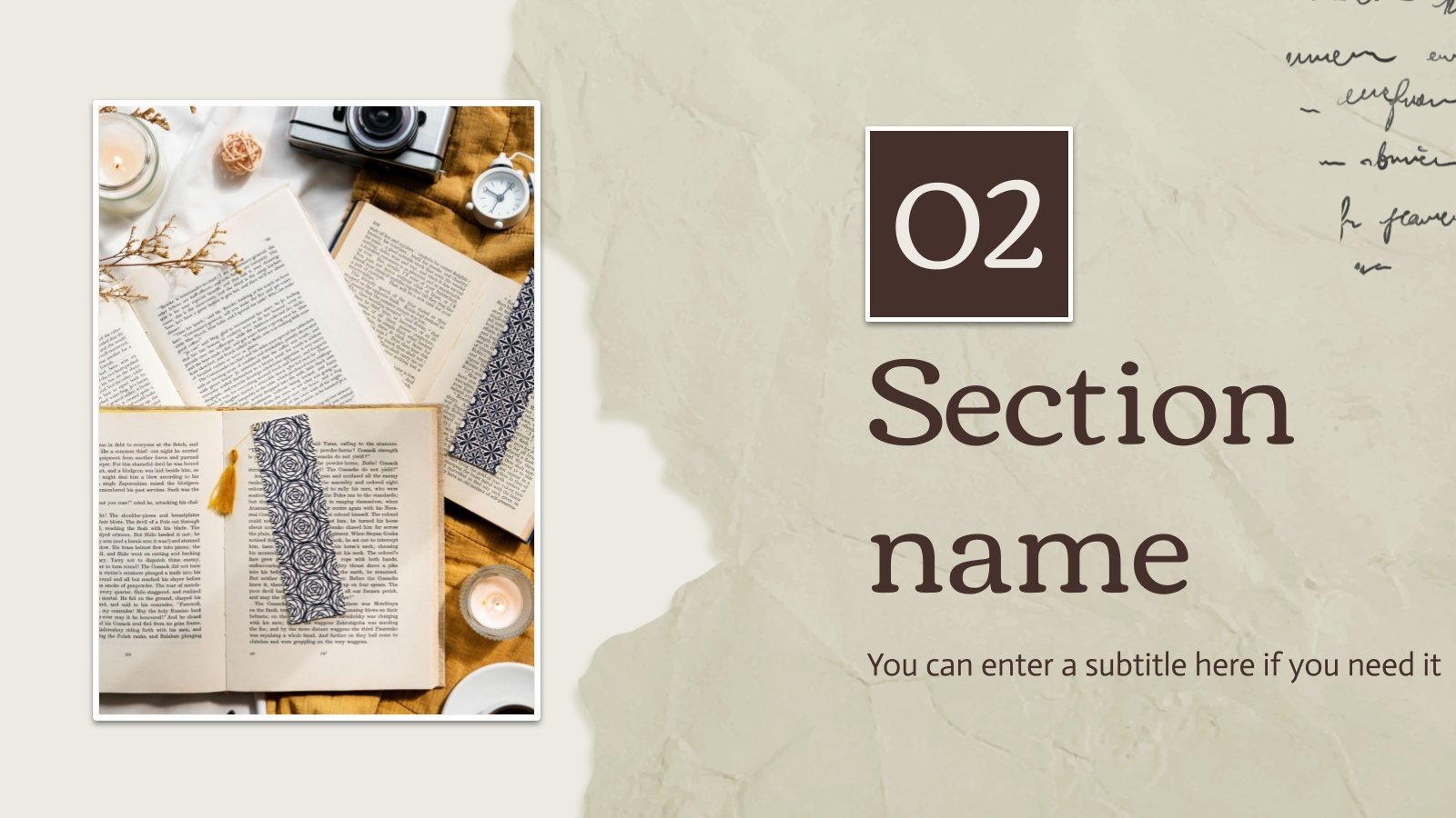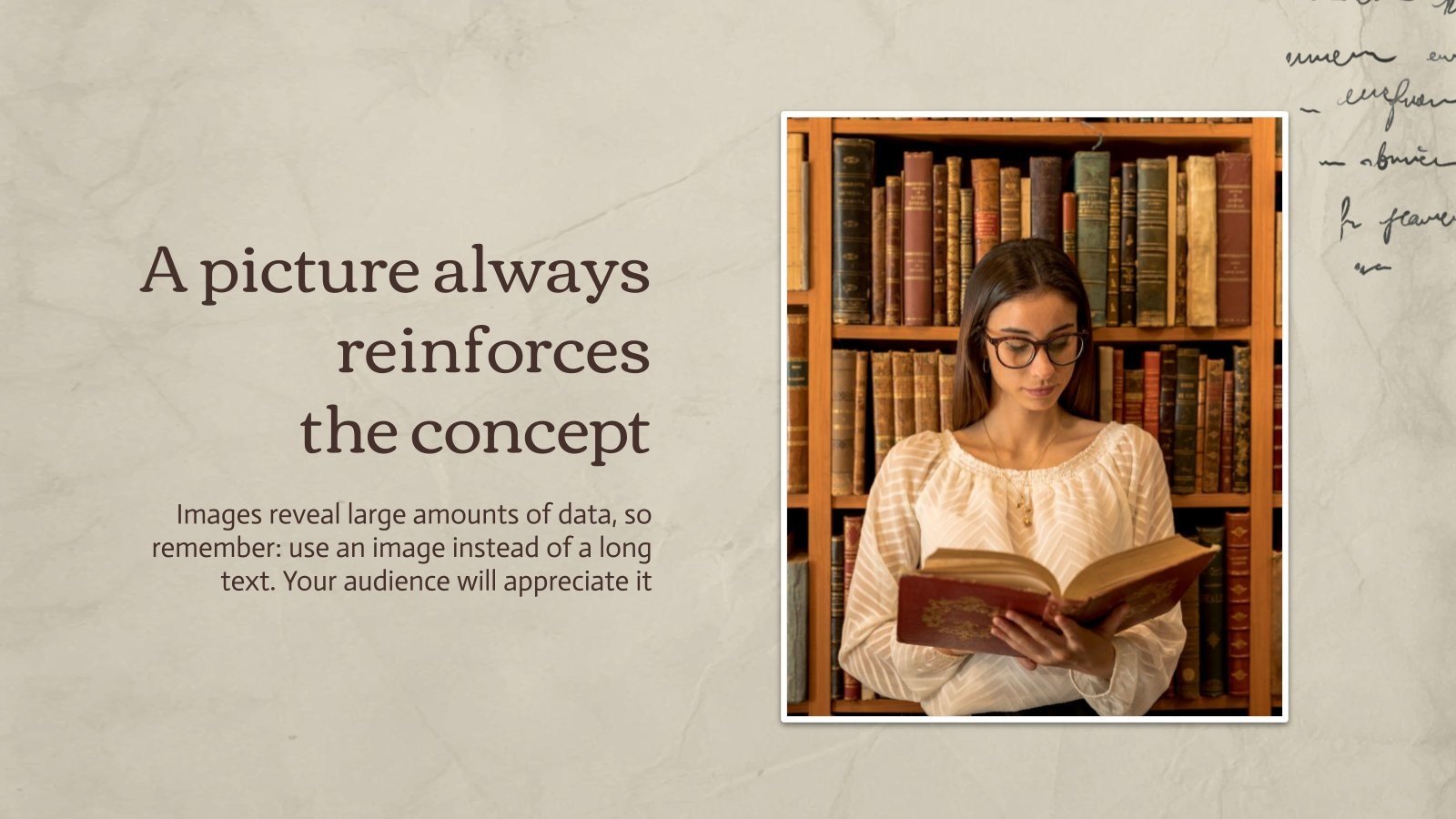 “下载 PowerPoint 或 Google 幻灯片的最重要的文学作品演示文稿,并开始用创意和原创设计给观众留下深刻印象。像这里这样的 Slidesgo 模板提供了通过使用不同的图形资源以清晰、简洁和直观的方式传达概念、想法或主题的可能性。你需要谈论一个特定的话题,但你不知道该怎么做?尝试使用像这样的演示文稿,100% 可定制!