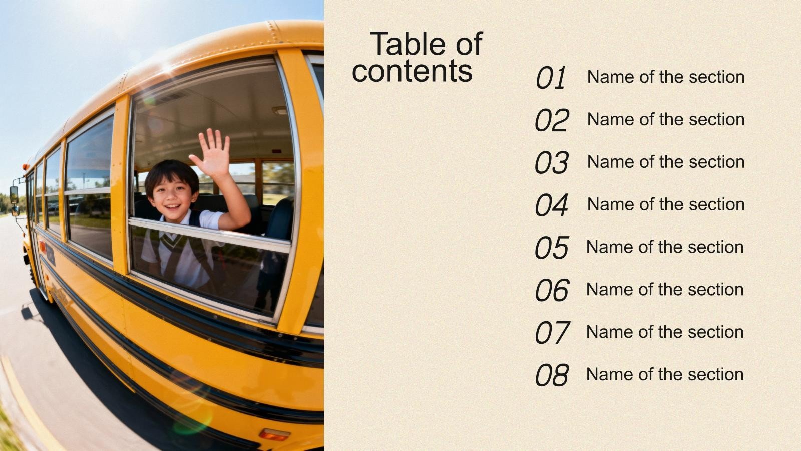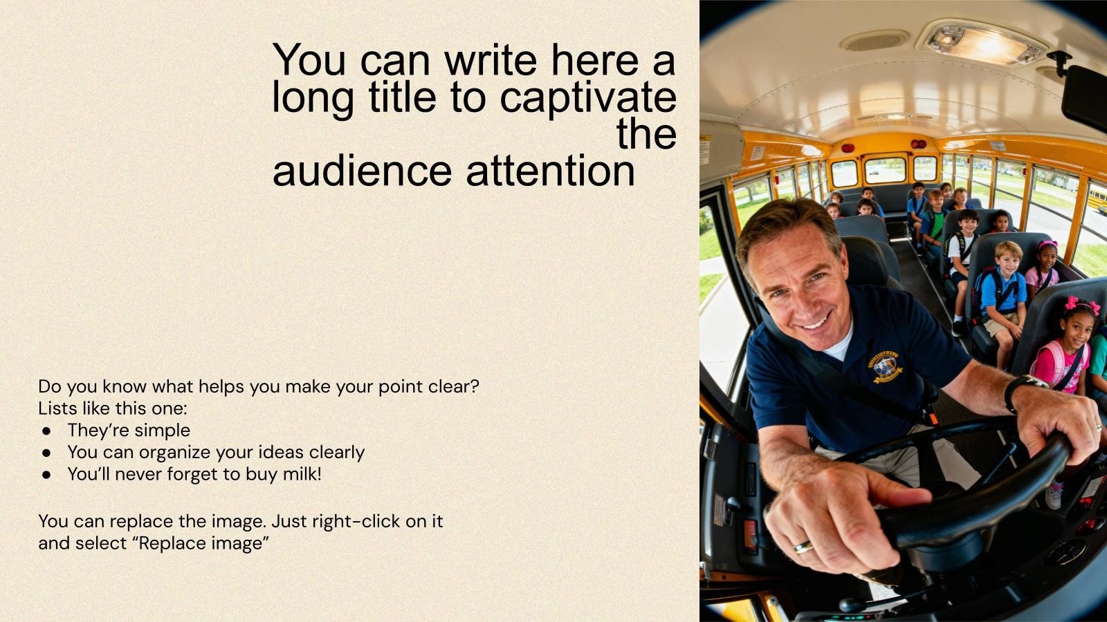 “下载校车司机日演示文稿,支持PowerPoint或Google幻灯片,开始用创意和原创的设计打动你的听众。像这里这样的幻灯片模板,可以通过不同的图形资源,以清晰、简洁和直观的方式传达一个概念、想法或主题。你需要谈论一个具体话题,但你不知道怎么说?试试用像这里这样的演示,百分之百可定制!”